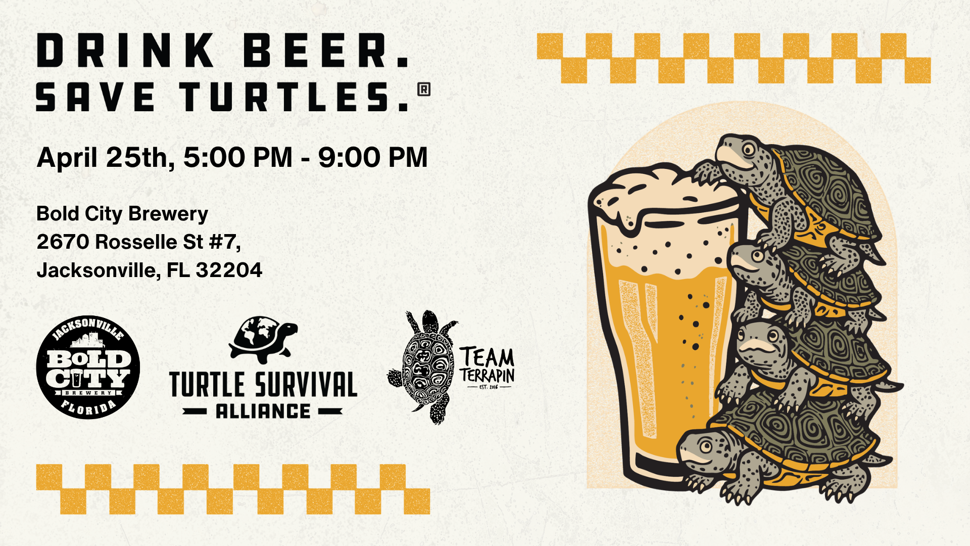 Join us on Saturday, April 25th, from 5:00 – 9:00 PM at Bold City Brewery on Roselle Street for this amazing Drink Beer. Save Turtles.® event!